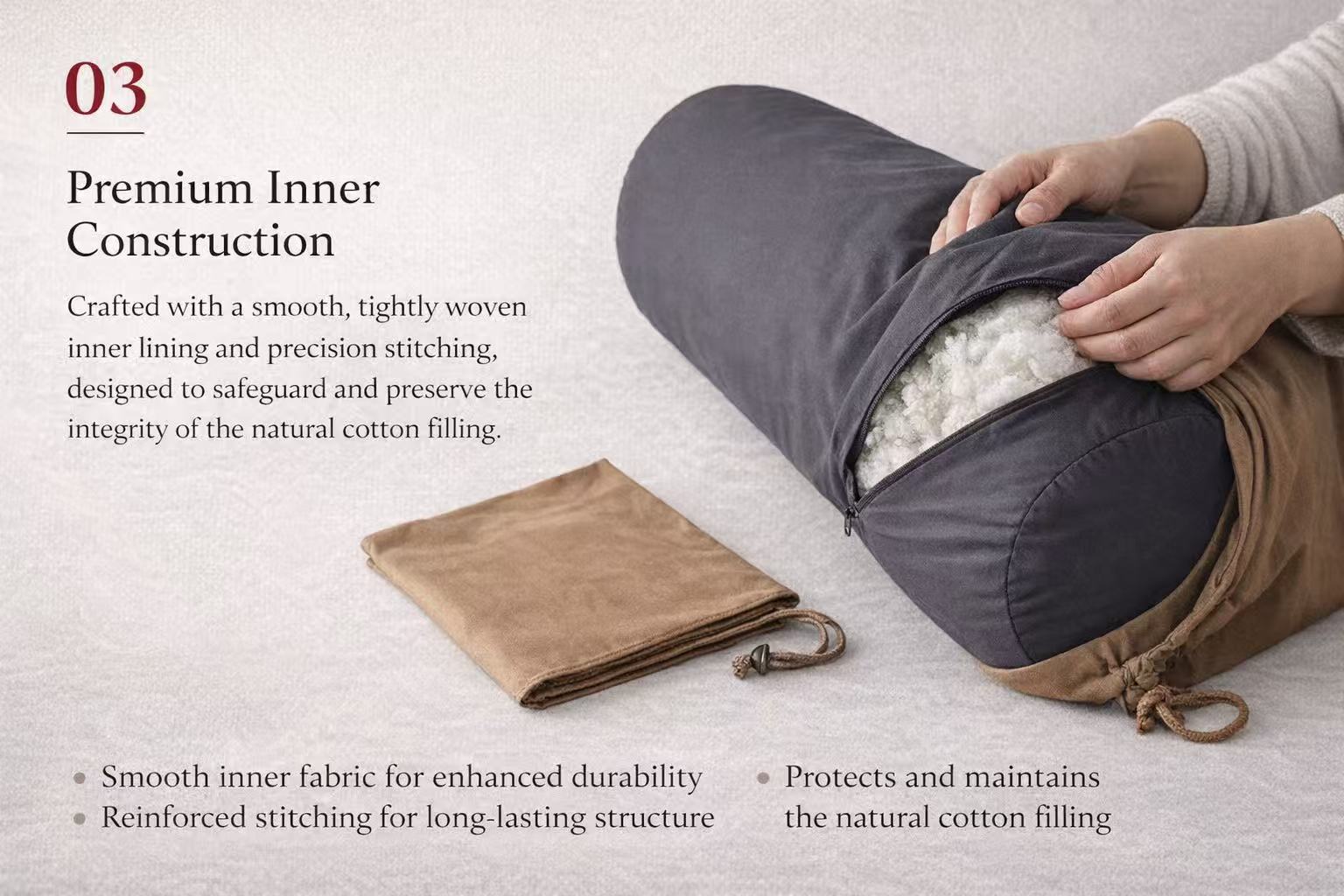 Meticulously Hand-Filled: Each bolster is packed by hand to achieve a specific density (2.9kg ) ensuring it won’t deform even after years of studio use.