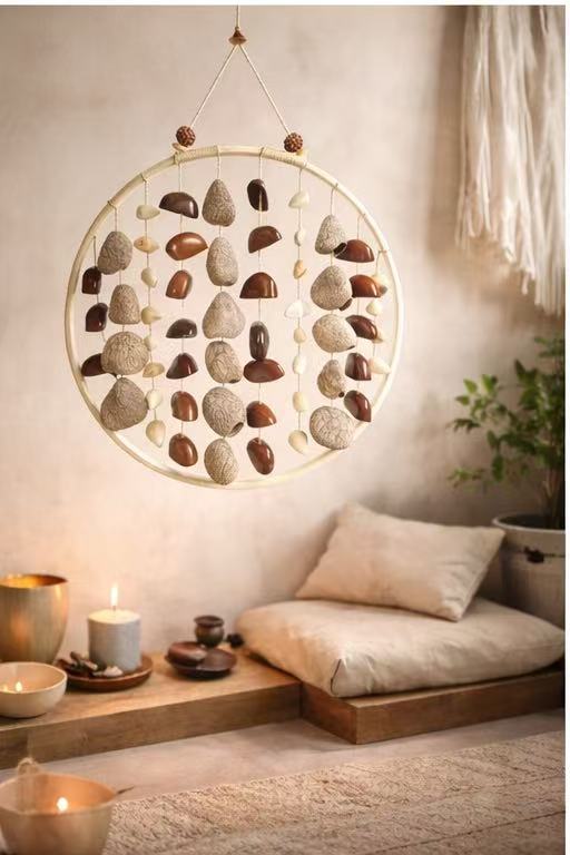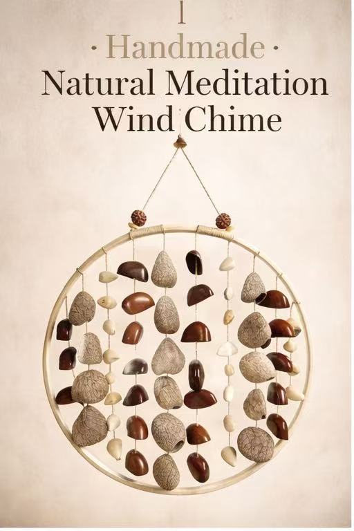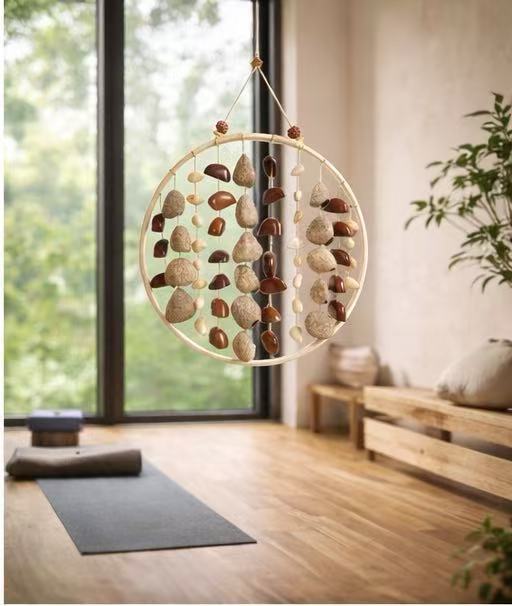 This handmade wind chime is crafted from natural seeds and wood, designed to create a warm, peaceful atmosphere in yoga rooms, meditation spaces, and healing environments.