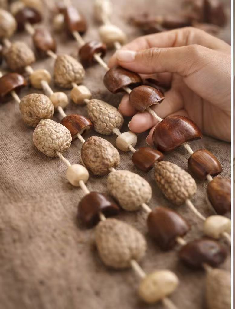 Made from natural seeds and wooden elements, each piece carries a unique organic texture and gentle sound, perfect for relaxation and mindfulness.