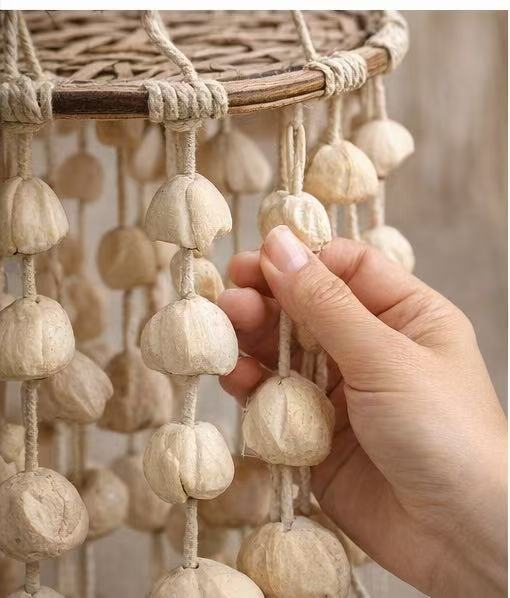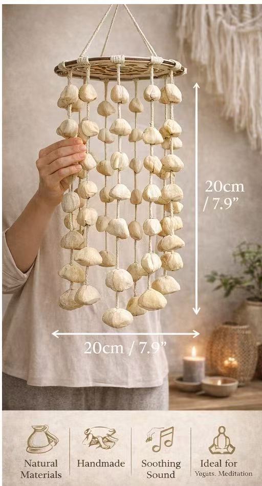 This handmade wind chime is crafted with natural shell/seed pieces and a woven bamboo top. Its soft, earthy movement and subtle sound help create a peaceful environment—perfect for meditation, breathwork, or simply slowing down.