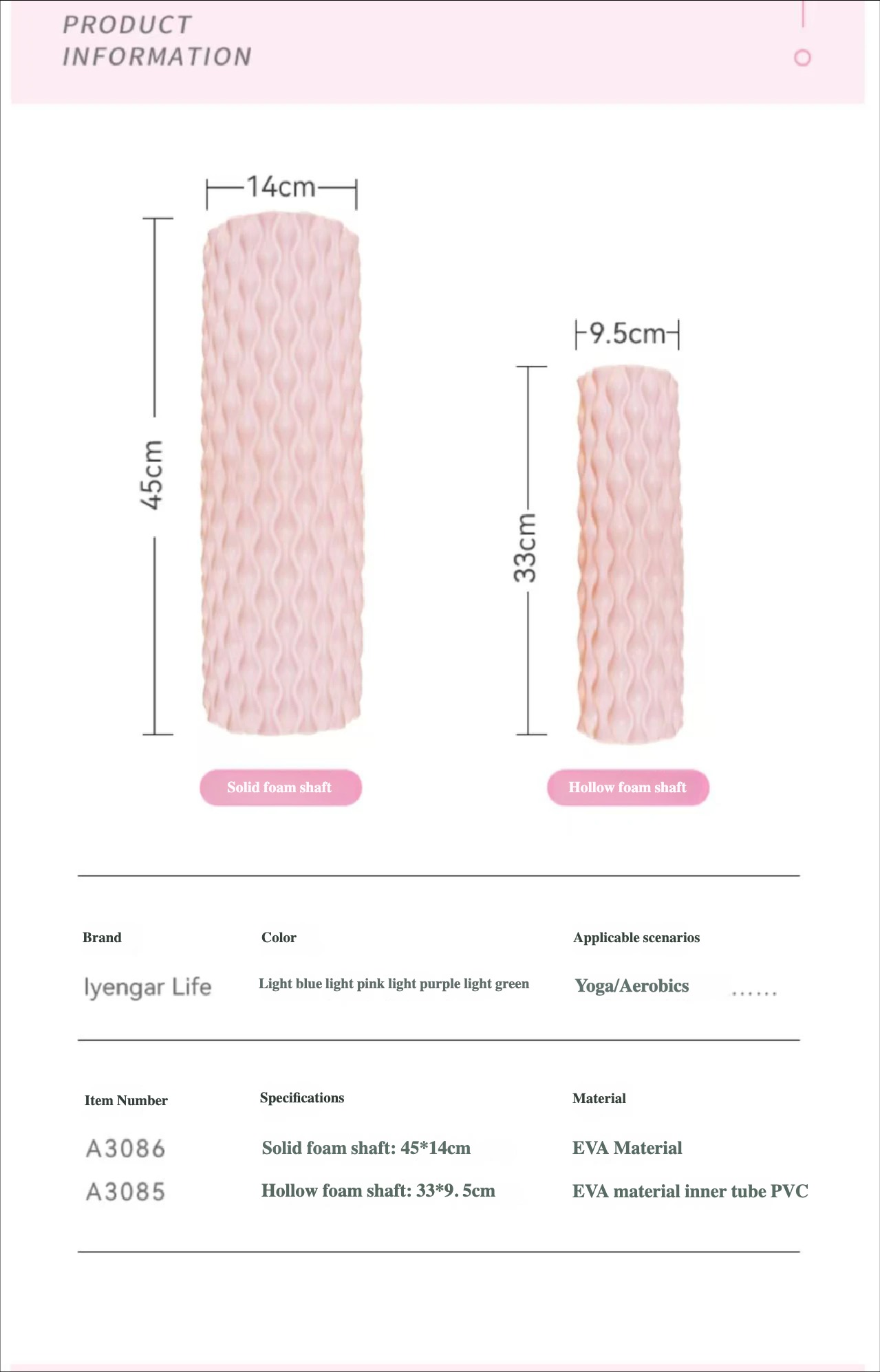 Made from high-quality EVA material, this roller is odorless, eco-friendly, and skin-comfortable. Choose the solid foam version for powerful deep tissue rolling or the hollow core version with PVC inner tube for lightweight strength and durability. Perfect for legs, back, shoulders, arms, glutes, and full-body muscle recovery—at home, in the gym, or on the go.